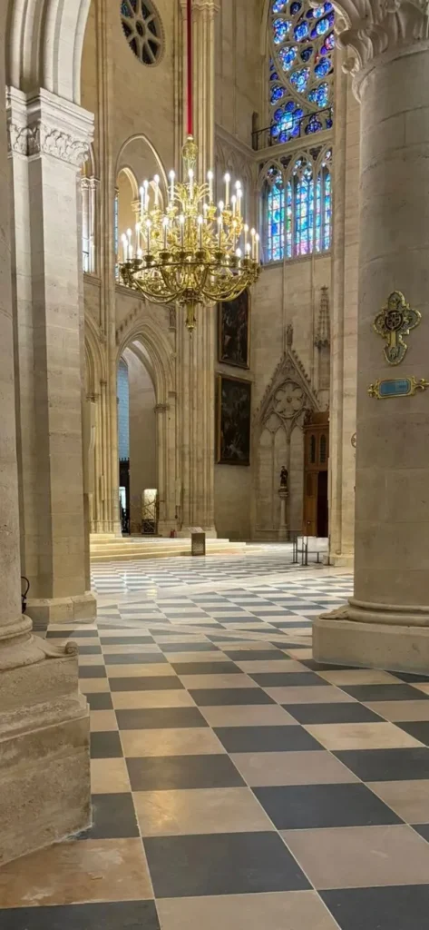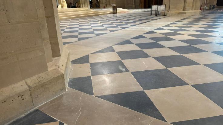 Ce marbre, choisi pour sa ressemblance avec les matériaux d’origine de Notre-Dame, a été méticuleusement extrait et travaillé afin de recréer les dalles blanches du célèbre damier qui recouvre la nef et les transepts de la cathédrale.