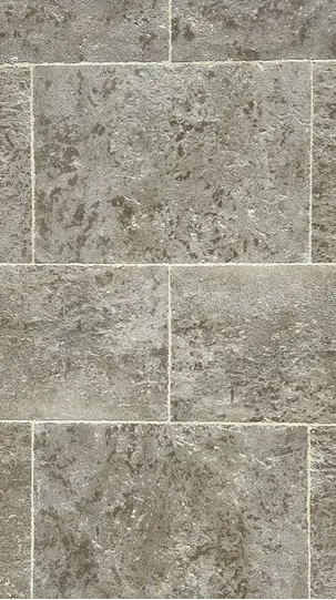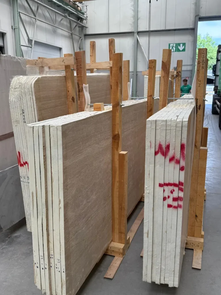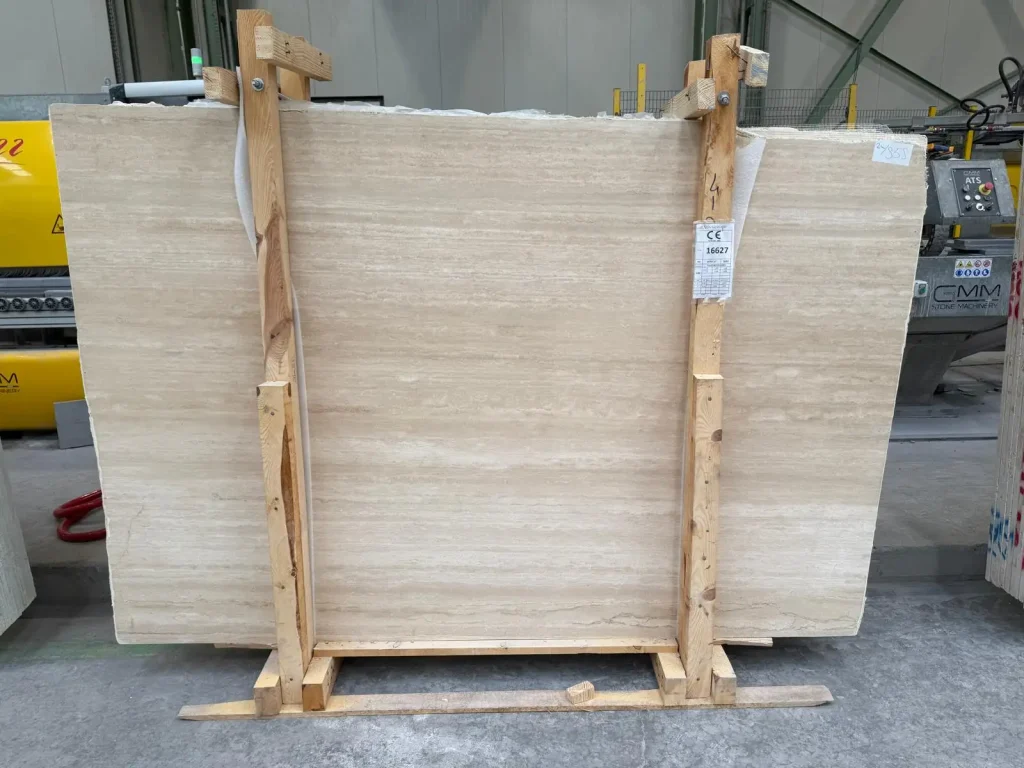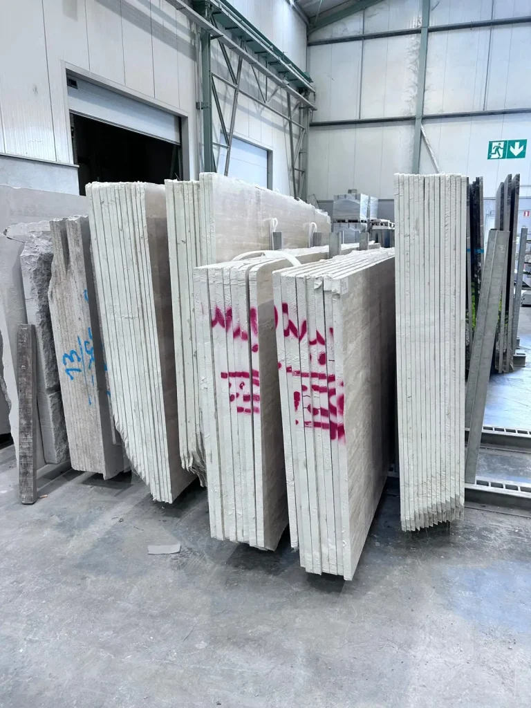 2. La pierre est sciée perpendiculairement aux couches sédimentaires du bloc. Cela fait apparaître des lignes continues et régulières — un aspect strié, linéaire et élégant, très contemporain. On voit clairement les “couches” sédimentaires formées dans la roche. C’est l’apparence la plus courante dans les travertins traditionnels.  ↩︎